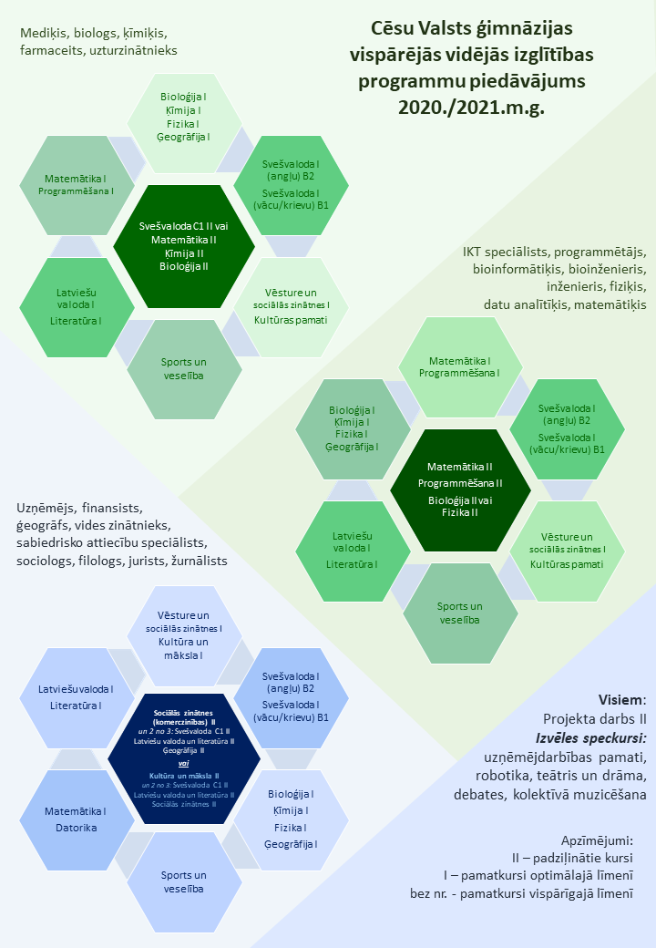 Latviešu valoda un literatūra, angļu valoda, matemātika, 1. padziļinātā kursa (pēc izvēles), 2. padziļinātā kursa (pēc izvēles)